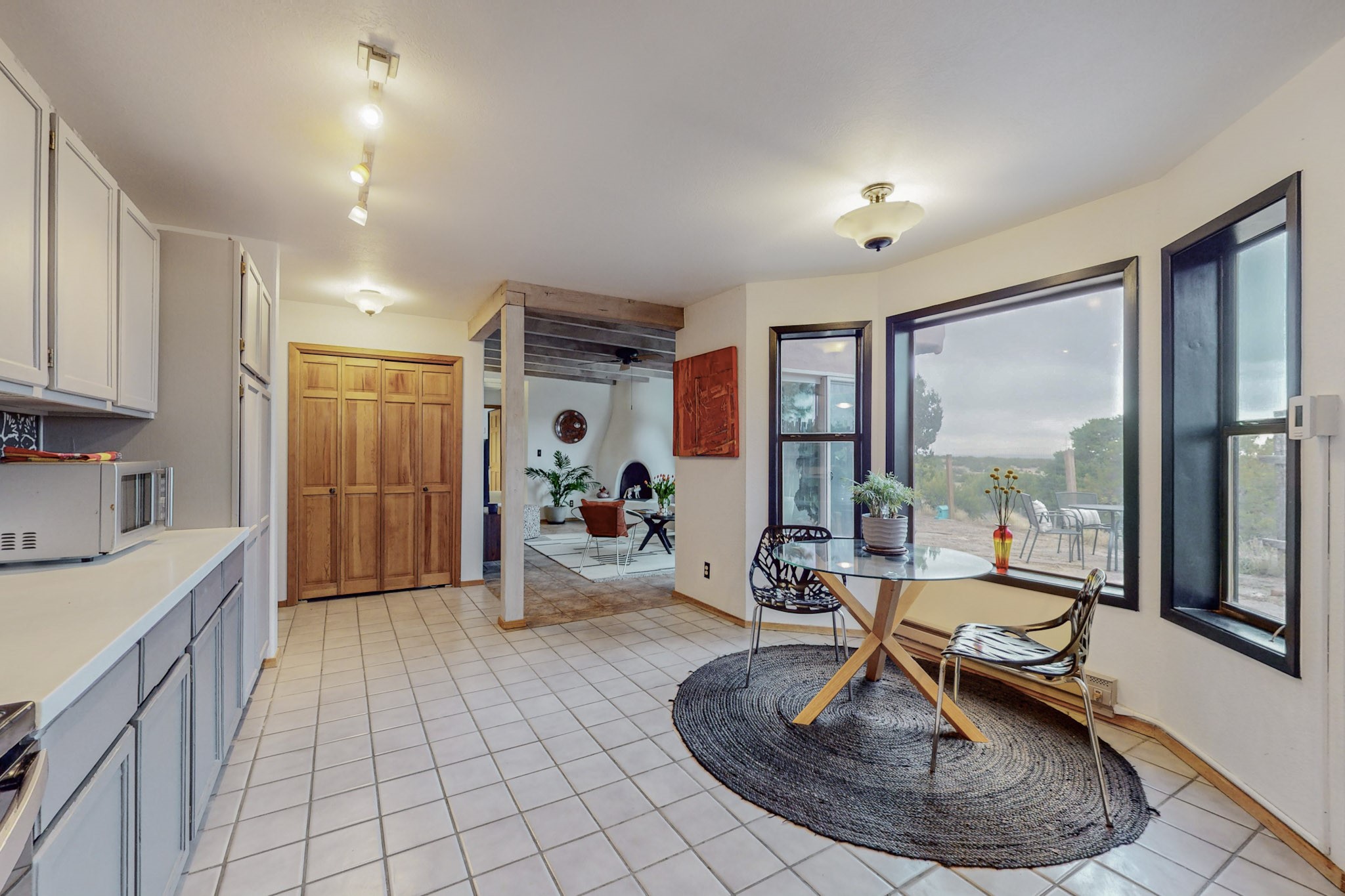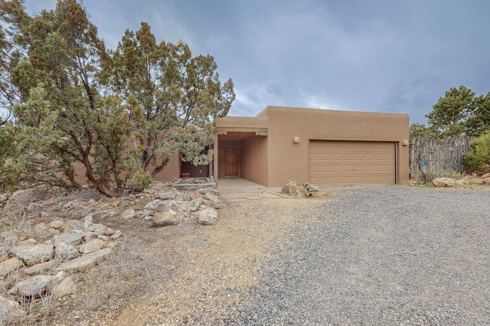 Sparkling, bright contemporary pueblo home on 1.8 private acres. This lovely open plan, passive solar design built by Sierra Homes sits back off the road taking full advantage of the privacy that this land provides and sunset mountain views. The living room features a lovely custom kiva fireplace to cosy up to on winter evenings. The updated kitchen includes a sunny dining area overlooking the patio and privately fenced yard. The home has been freshly painter both inside and out. There is a portalled entry patio for shady afternoon relaxation and a south patio for evening entertainment. There is a large 2 car mouse proofed garage and a circular driveway with lots of parking. The land borders a large greenbelt, is within easy reach of Eldorado amenities, the rail trail and local shopping and only minutes into Santa Fe.