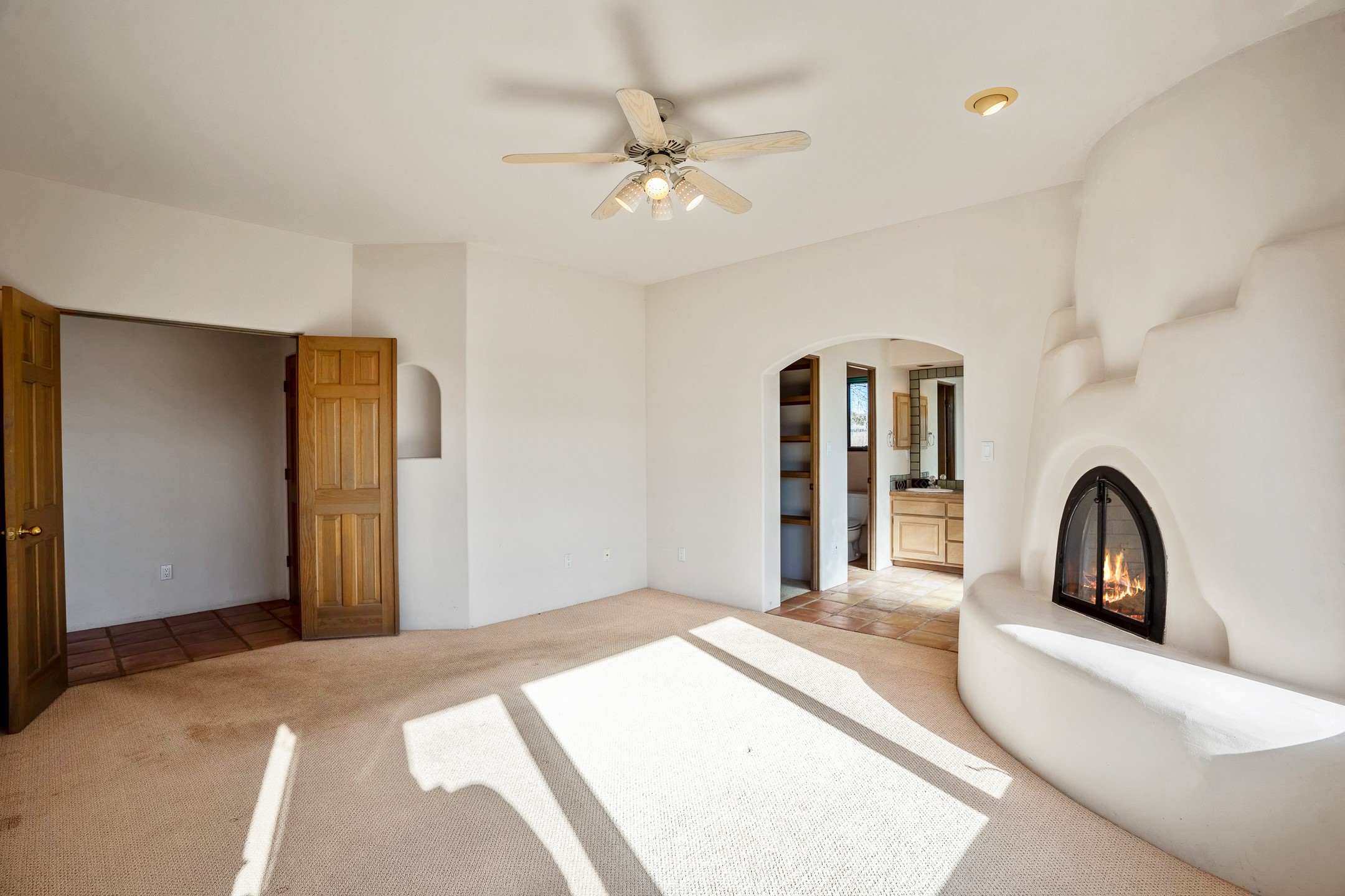 Down a long driveway, situated on a bright hill, you will find a sanctuary of Santa Fe style. Sunlight streams into classic spaces full of design, artistry, and absolute peace. With gorgeous mountain views, you will be inspired day in and day out. The sensible floorplan provides an elegant dining area, an eat-in kitchen that opens to the living room. Custom kivas grace the living room and primary bedroom. Handmade details throughout the property will have you in awe. The guest bedrooms are well separated from the primary suite, which features double sinks, a glass enclosed shower, a large soaking tub and custom walk-in closet. A large walled garden behind the house is easily accessed from the living room, primary bedroom, and eat-in kitchen. The separate laundry room and two car garage provide excellent organizing areas. Step out your door and get on the Eldorado trail system, or go visit your horse at one of the nearby barns. Quick access to the amenities of Eldorado, and only 20 minutes from town. You have to see this special property! Book a showing today!