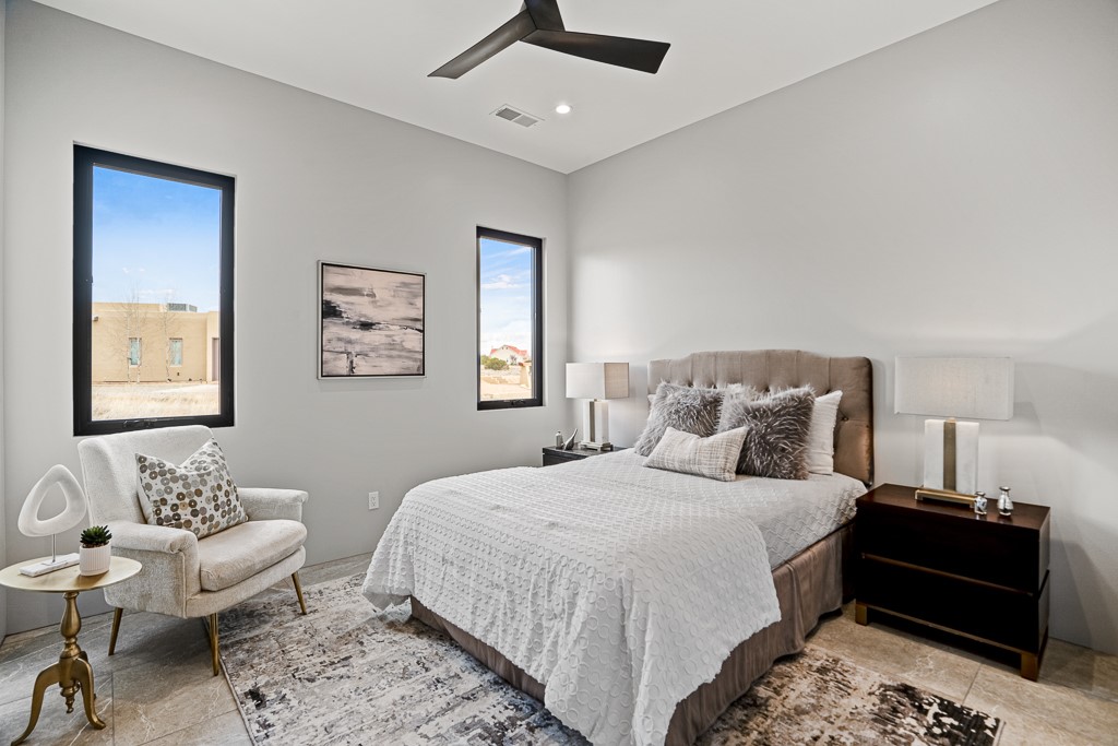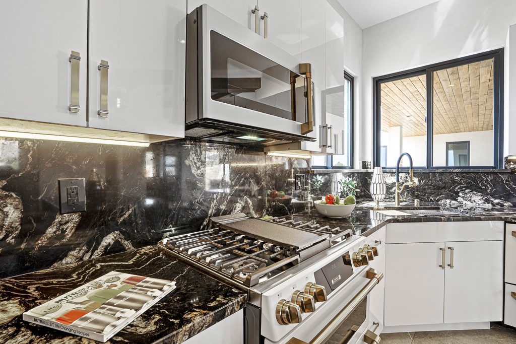 Hello gorgeous! Step into luxury living at its finest with this brand new custom build. This stunner features a 3-bed, 2-bath sanctuary boasting unparalleled mountain and sunset views. From the moment you arrive, modern convenience and elegance greet you at every turn. As you enter through the front door, a state-of-the-art camera system ensures security, while a smart lock system provides effortless access. The walls shimmer throughout the home with sophisticated gray Venetian plaster. The kitchen is a chef's dream, featuring bold black and gold granite, the newest white and gold Cafe brand matching appliances, both under and over cabinet lighting, and a full pantry with motion sensors, allowing for seamless hands-free navigation. Need a coffee bar? We've got you covered. Custom high-end spotlights illuminate the nichos and large wall space for art. Indulge in relaxation with smart bidet toilets and a luxurious deep soaking tub in the spa-like primary bathroom. There is a makeup vanity and an oversized primary closet as well, which includes motion sensor lights. Every detail has been considered for modern living, with USB and USB-C chargers in the primary suite, additional bedrooms, and office; as well as USB plugs in the kitchen for added convenience. Control the ambiance with dimmer switches on all lights, while adjustable backlit LED mirrors add a touch of sophistication to every bathroom. And for eco-conscious residents, an electric vehicle charger is conveniently installed in the two-car garage. Whether unwinding after a long day or entertaining guests, this property offers the epitome of luxury living. Welcome home!