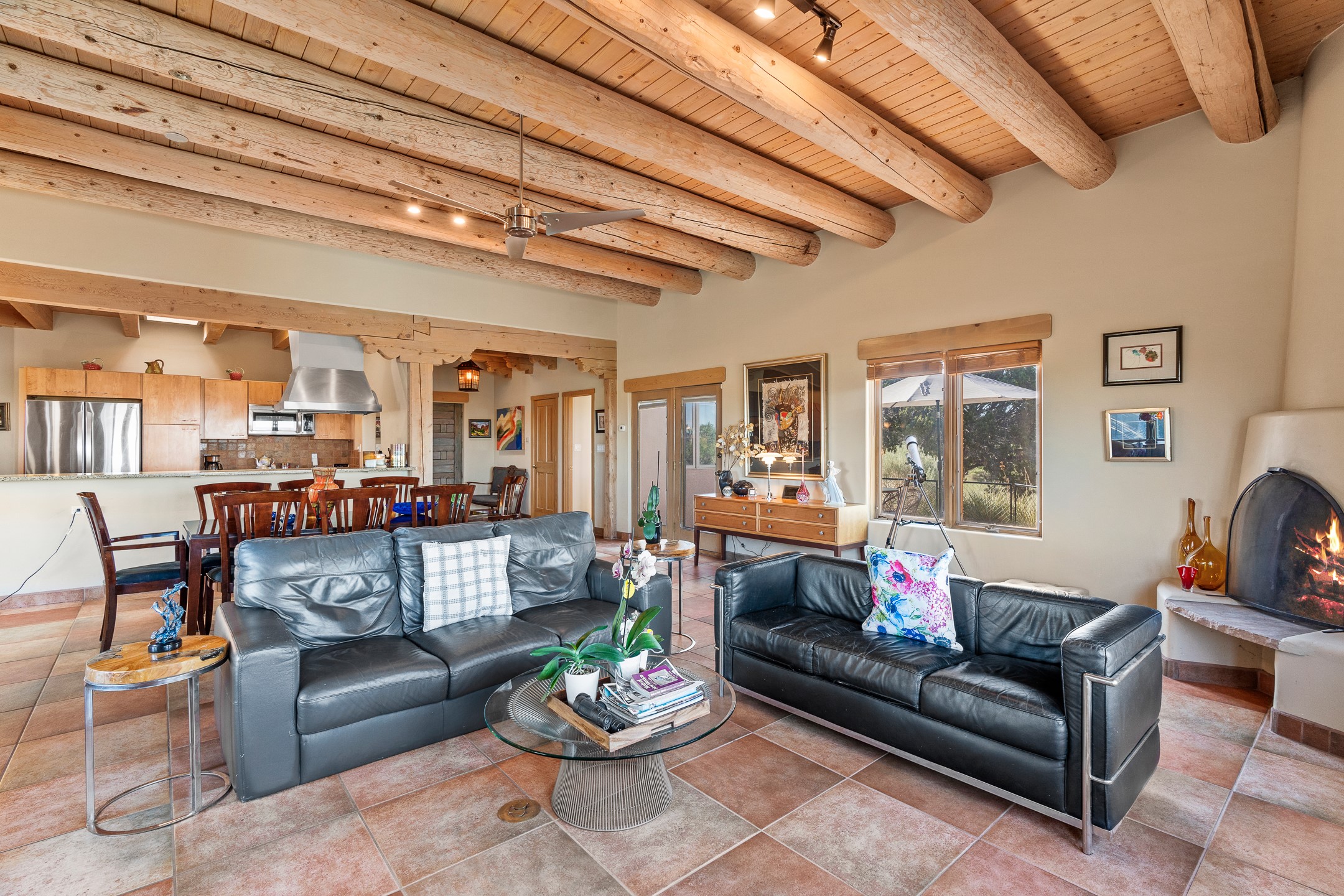A hidden gem nestled at the end of the cul-de-sac! As soon as you walk in the door, you can feel the quality of craftsmanship and the care that has been put into this property. The formal entryway provides the perfect introduction to a large open concept living room with high ceilings, beautiful vigas and a view towards the chef's kitchen, which features granite countertops, custom pull-out drawers, and high end appliances. From the living room and primary bedroom windows, your eye travels to distant mountains. A unique and sensible floorplan, there are two guest bedrooms each with their own outdoor access. There is also an office space that is currently being used as a painting studio, with a newly added bathroom as well. The primary suite is large and cool, with wonderful closet space, and features "his" and "hers" sinks in the primary bathroom. This home would be ideal for anyone who had family members or guests coming to stay, as each would have their own entrance if desired. The meticulously manicured grounds will please even the most discerning buyers. The exterior wood and stucco have just been painted. The current sellers have pruned the trees and underbrush throughout the property. There is even a viewing deck that showcases the surrounding mountain ranges! Don't miss this absolute gem of a property. Schedule a showing today!